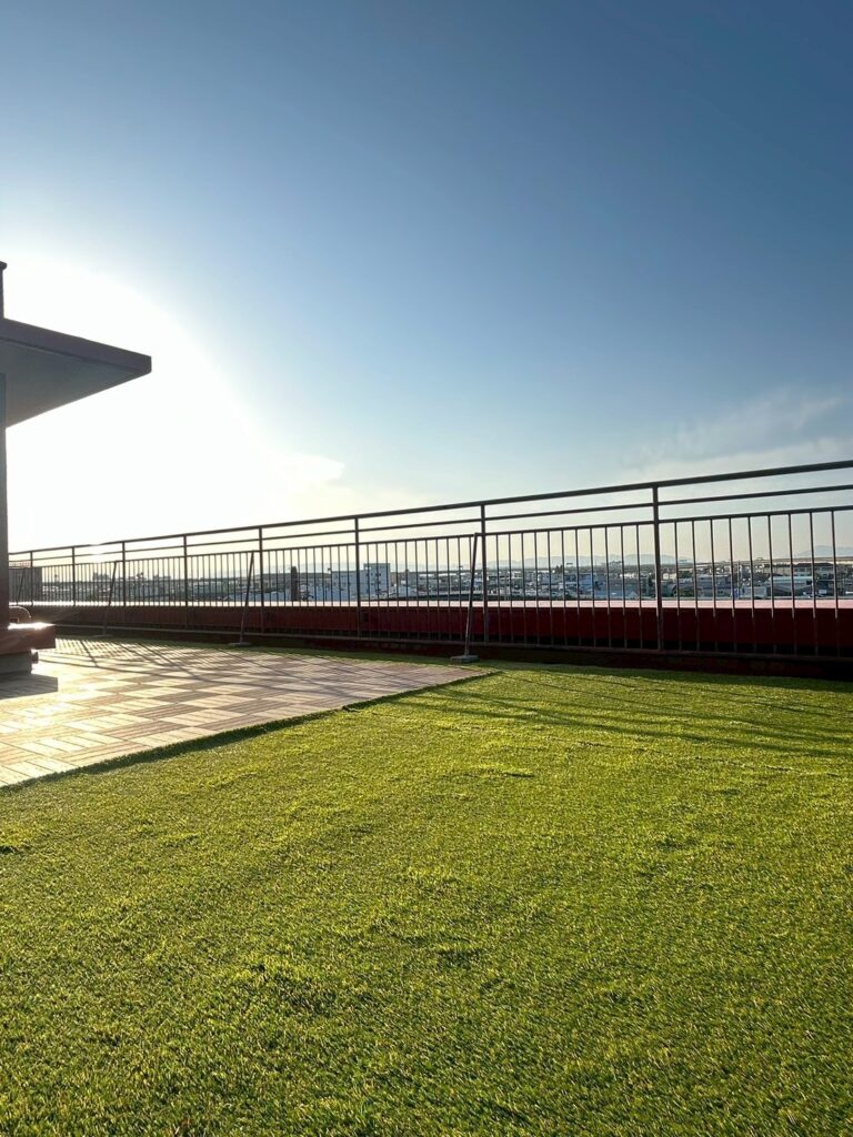 ウッドパネルの直線的なラインと人工芝の柔らかな質感が、都会的なマンションの景観とマッチし、まるでホテルのような高級感のある仕上がりになりました。
