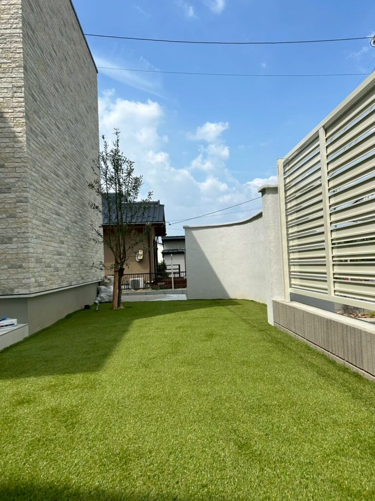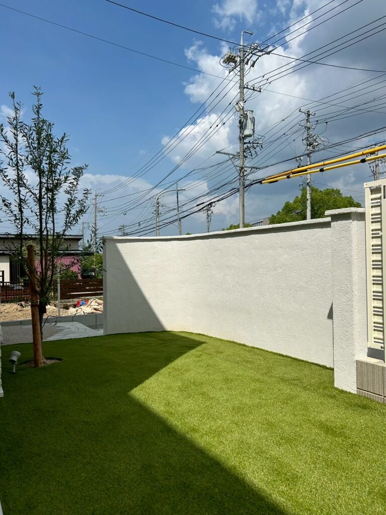 白い壁(外壁)と、鮮やかなグリーンの人工芝のコントラストが美しい、モダンなお庭が完成しました!