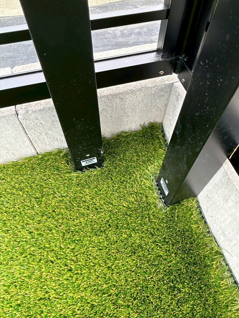 今回も、黒いフェンスの柱の根本まで、人工芝の継ぎ目や遊びが出ないようにぴたりと合わせました。この細かな施工技術があるからこそ、人工芝の浮き上がりや、わずかな隙間からの雑草の侵入を防ぎ、仕上がりの美しさを長期にわたって保つことができます。