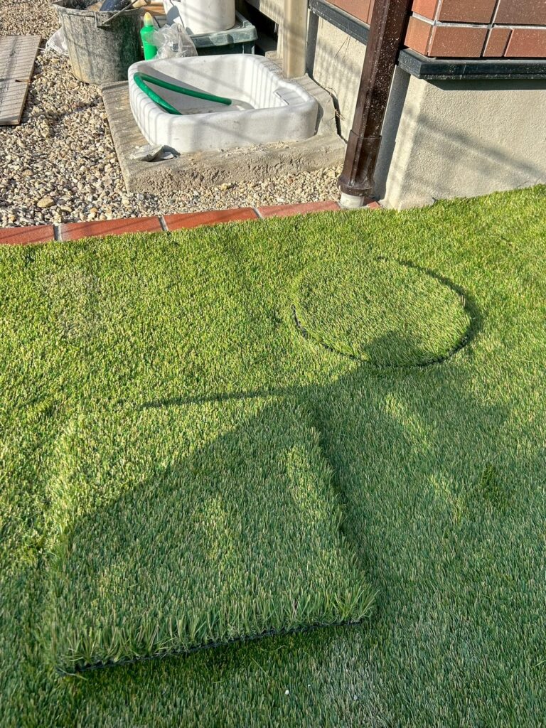 人工芝の施工で、仕上がりに差が出るのが「枡」の処理です。お写真をご覧いただくと分かる通り、今回も職人のこだわりを詰め込みました。
